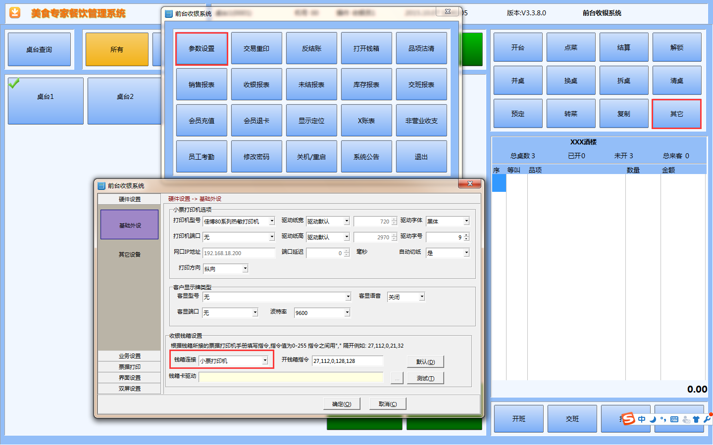 打开美食专家前台 点击其他-参数设置-基础外设找到*箱链接选择小票打印机