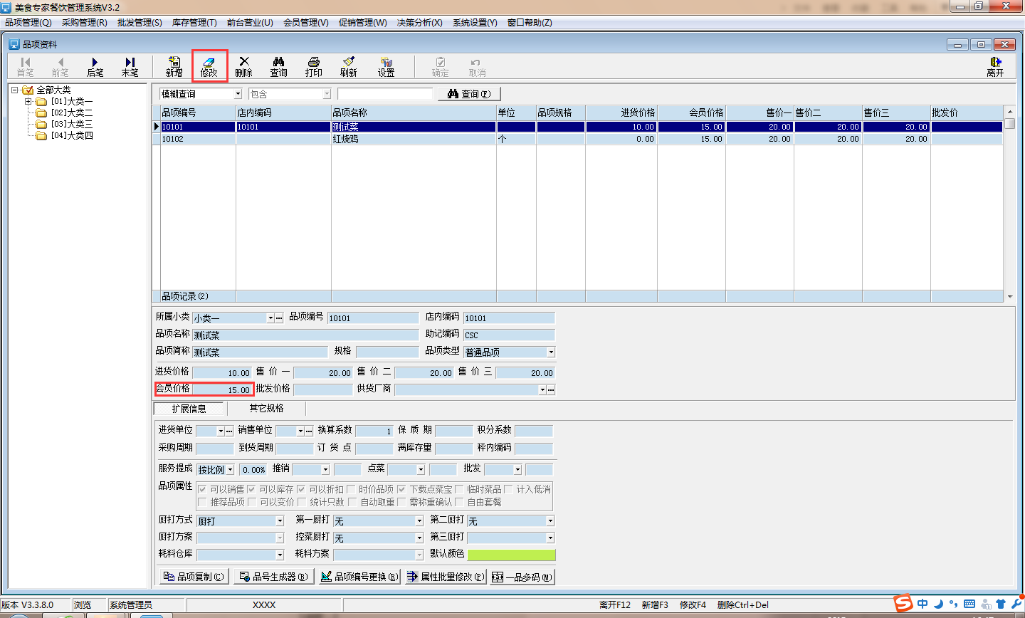 打开美食专家后台,点击品项管理-品项资料选择菜品点击修改把会员价格改下确定