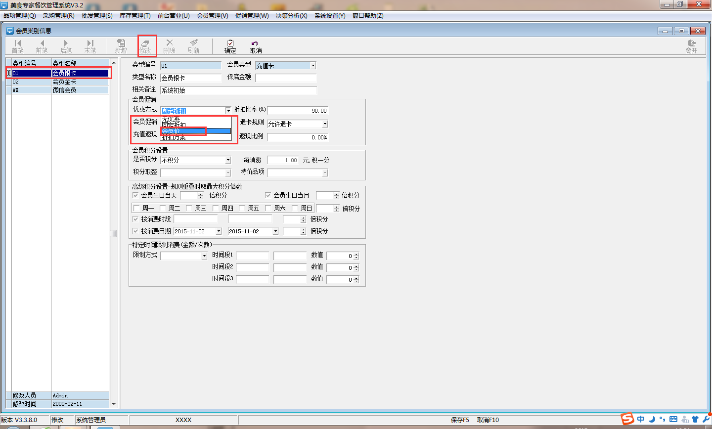 然后打开会员管理,点击会员类别信息选择会员卡点击修改在会员促销-优惠方式选择会员价就行了,进入前台点单结算时点会员登入刷卡,原价格就变成设置的会员价。