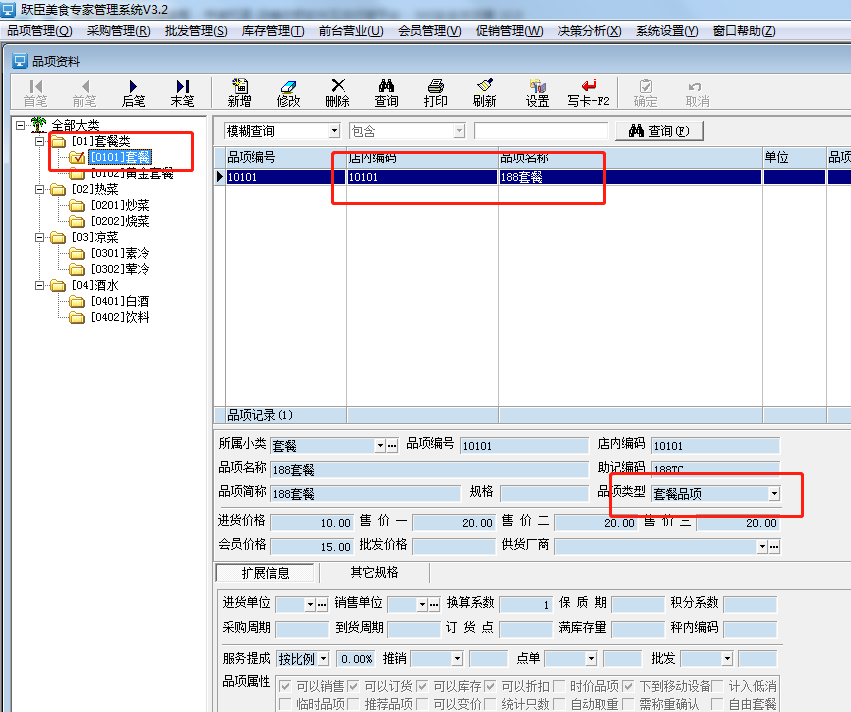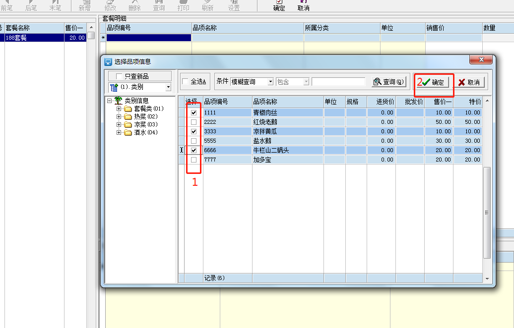3.点击品项质料,点击新增按钮,填写品项编号,品项名称,品项类型(选择套餐品项),价格等相关信息,点击确定按钮,点击关闭按钮。