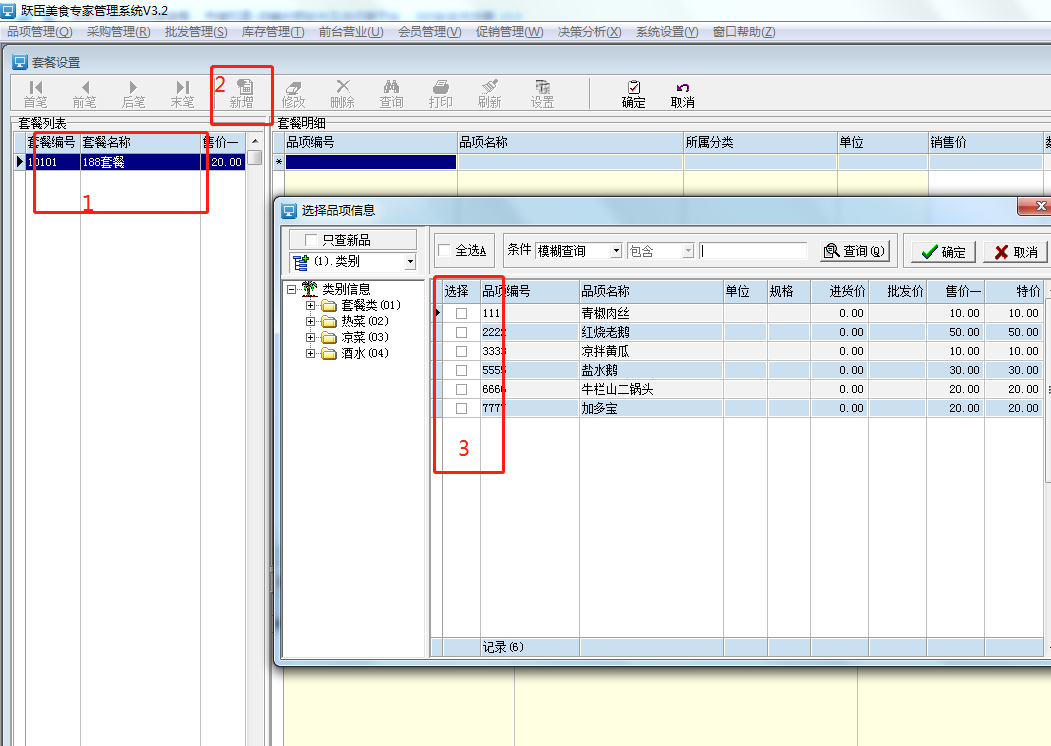 4.点击套餐设置,点击新增,选择相关选项点击确定,点击关闭按钮。