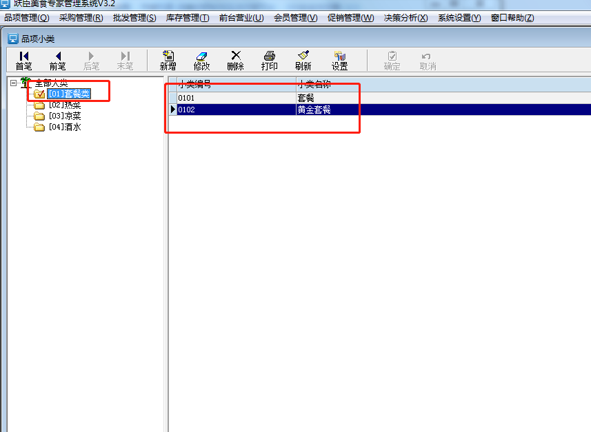 2.点击品项小类,点击新增按钮,填写小类编号,名称等相关信息,点击确定按钮,点击关闭按钮。