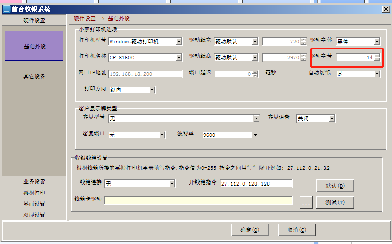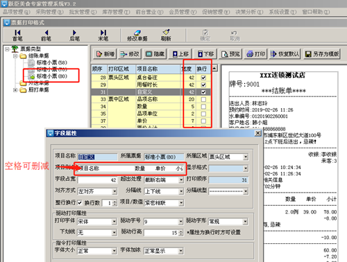 选中“标准小票”双击“自定义”,出现“字段属性”,在这里面进行编辑。这里一般调的是预打单和结账单的文字大小