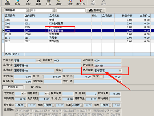 以**套餐888为例,在录入品相资料的时候,一定要注意,要把下面的“品项类型”选择为:套餐品项