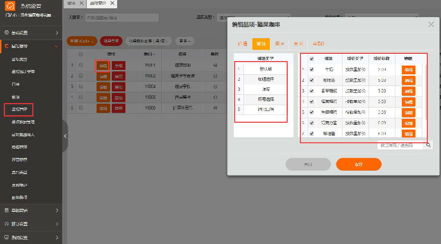 品项里面的口味:没有价格,一般用不到,做法:里面有价格可以筛选 (一般用这个)