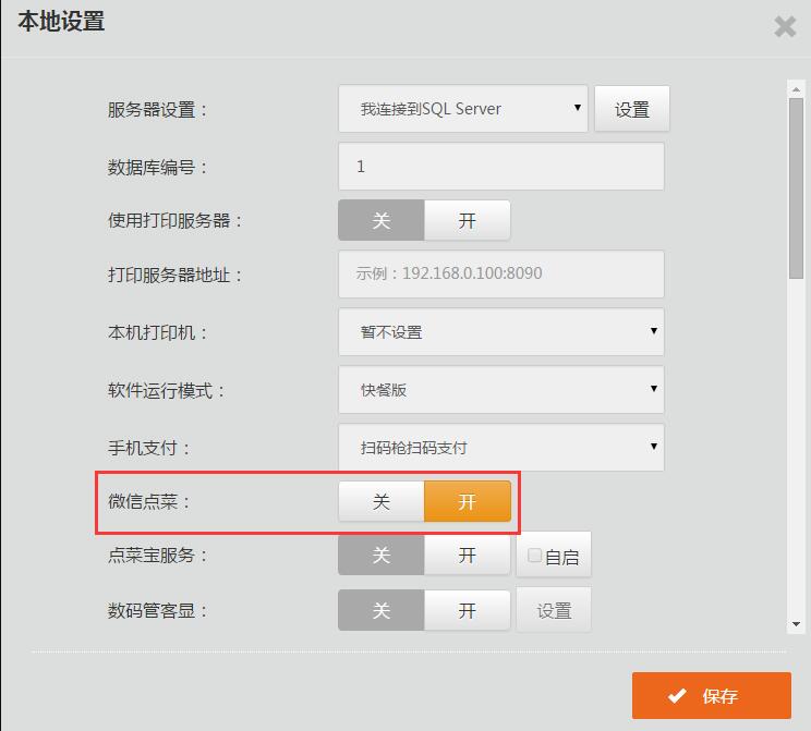主机IP:192.168.1.77 2台电脑:一台主机是快餐模式,副机是中餐模式 开启微信点餐,微信点餐只能一台电脑开启,在本机设置里开启微信点餐 一般在中餐模式电脑开启